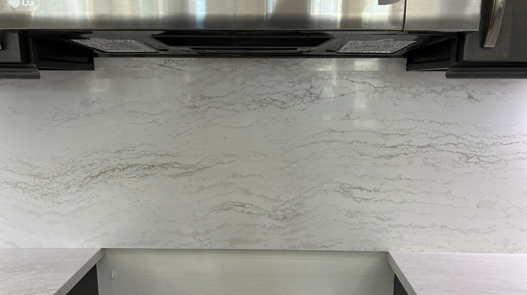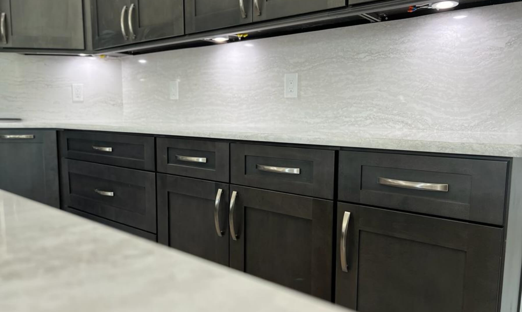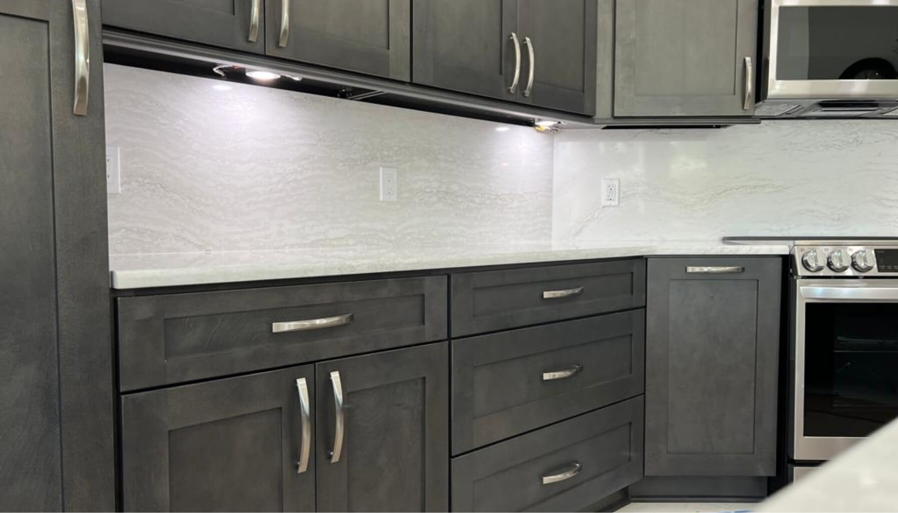 Client wanted storage for her cleaning items, utensils, and cutlery. We were able to create a more spacious kitchen by moving the refrigerator to the other side of the kitchen, adding drawer cabinets, base pull outs for her utensils Full backsplash with Cambria and shaker style cabinets.