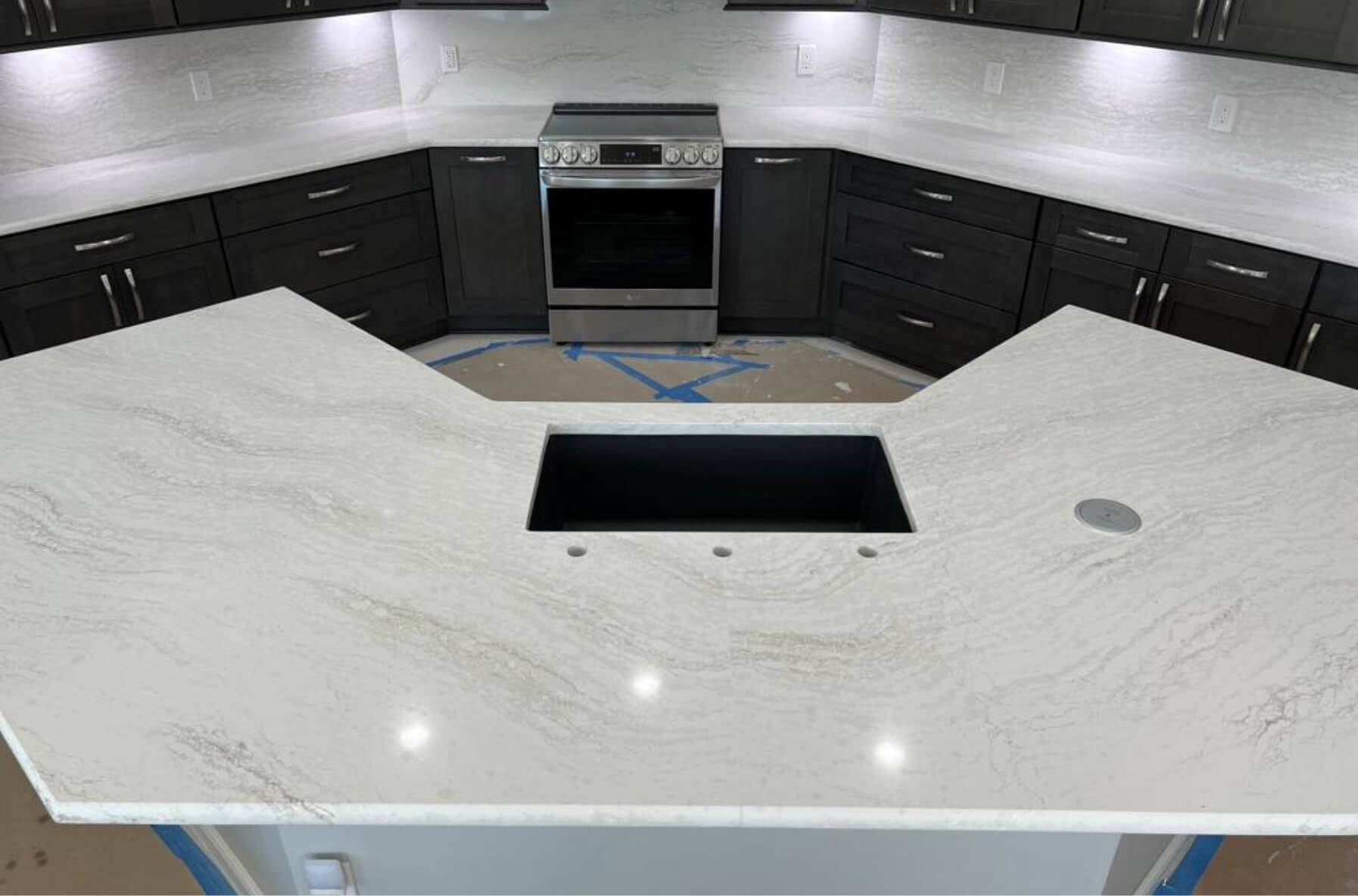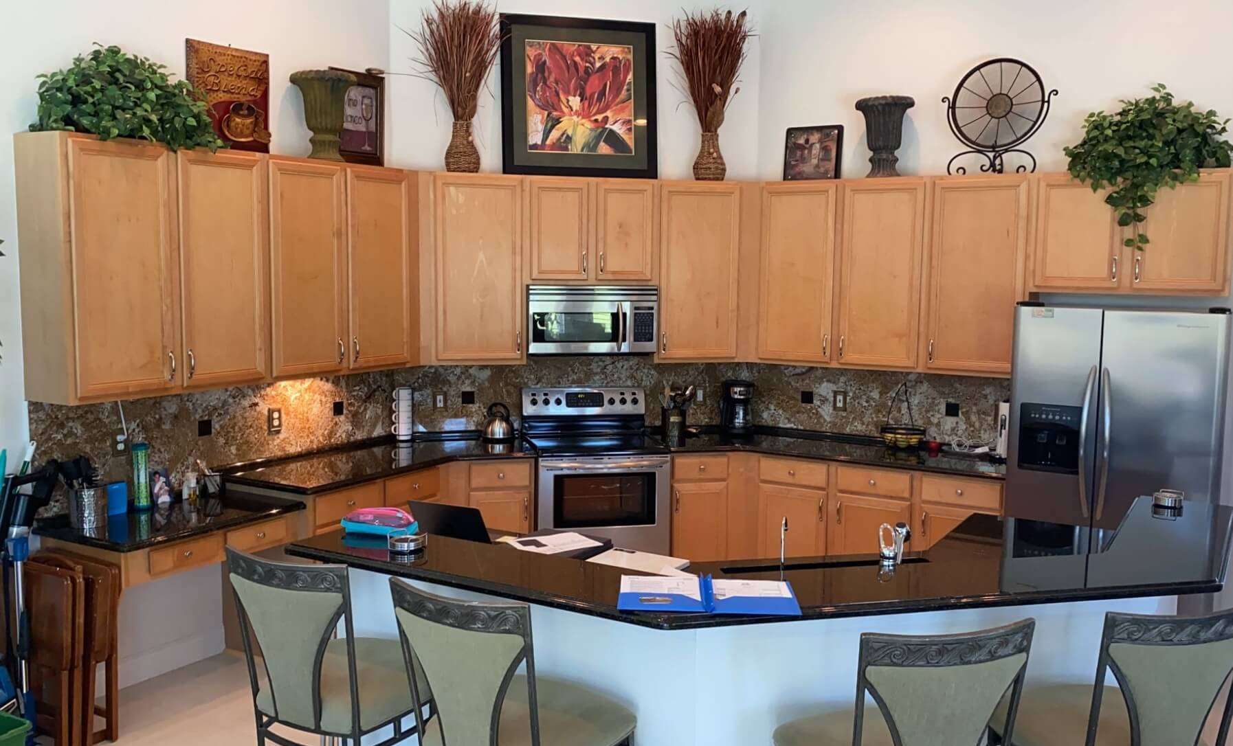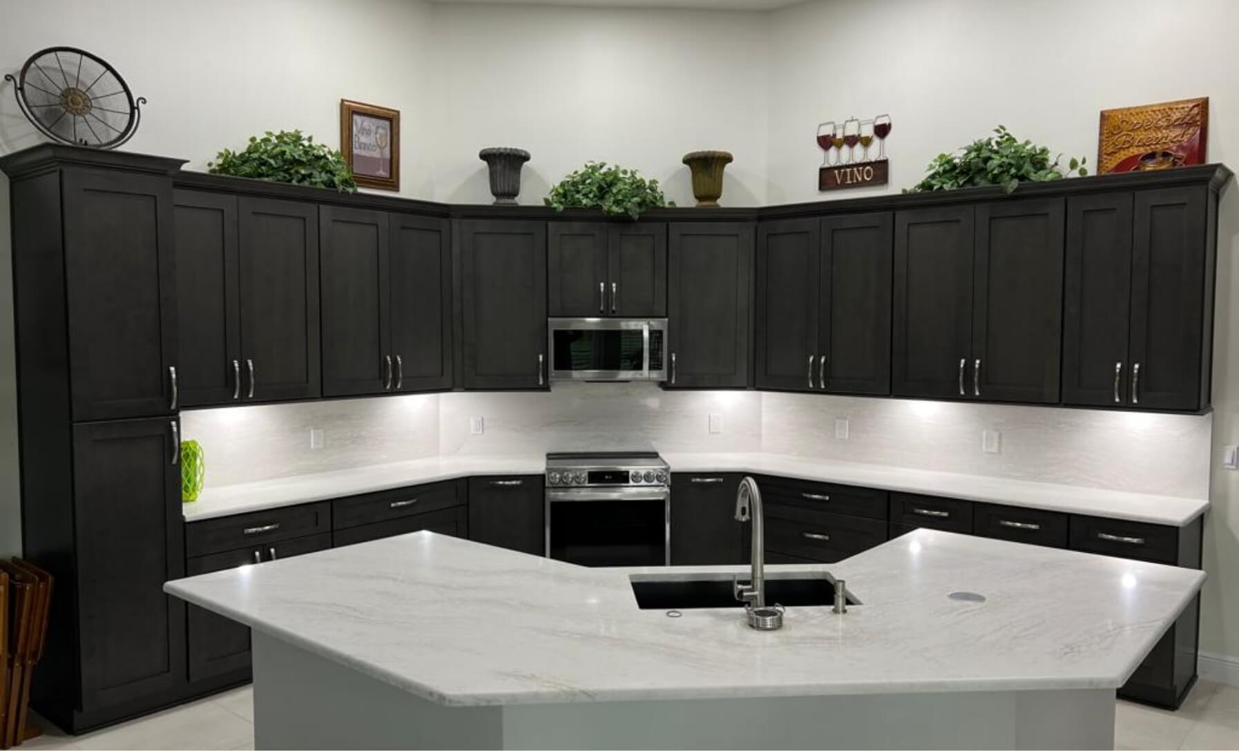 Client wanted storage for her cleaning items, utensils, and cutlery. We were able to create a more spacious kitchen by moving the refrigerator to the other side of the kitchen, adding drawer cabinets, base pull outs for her utensils Full backsplash with Cambria and shaker style cabinets.