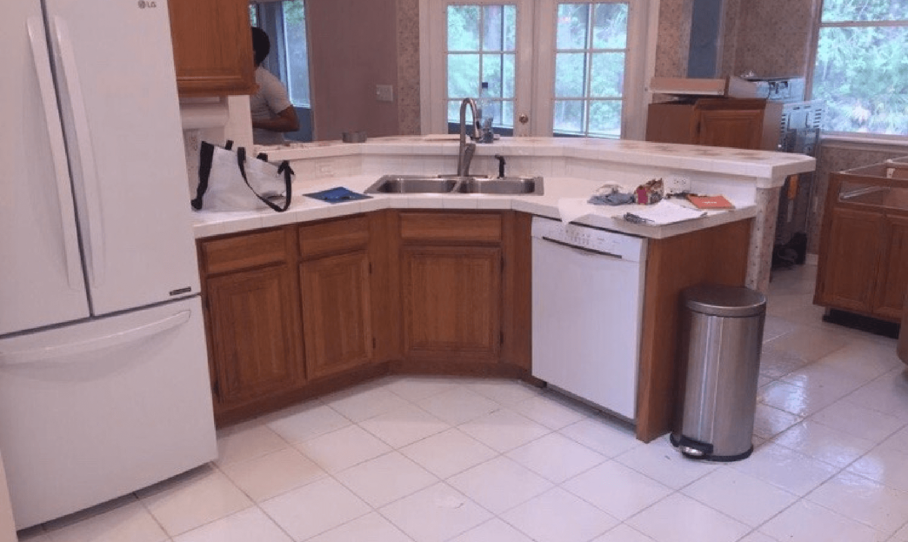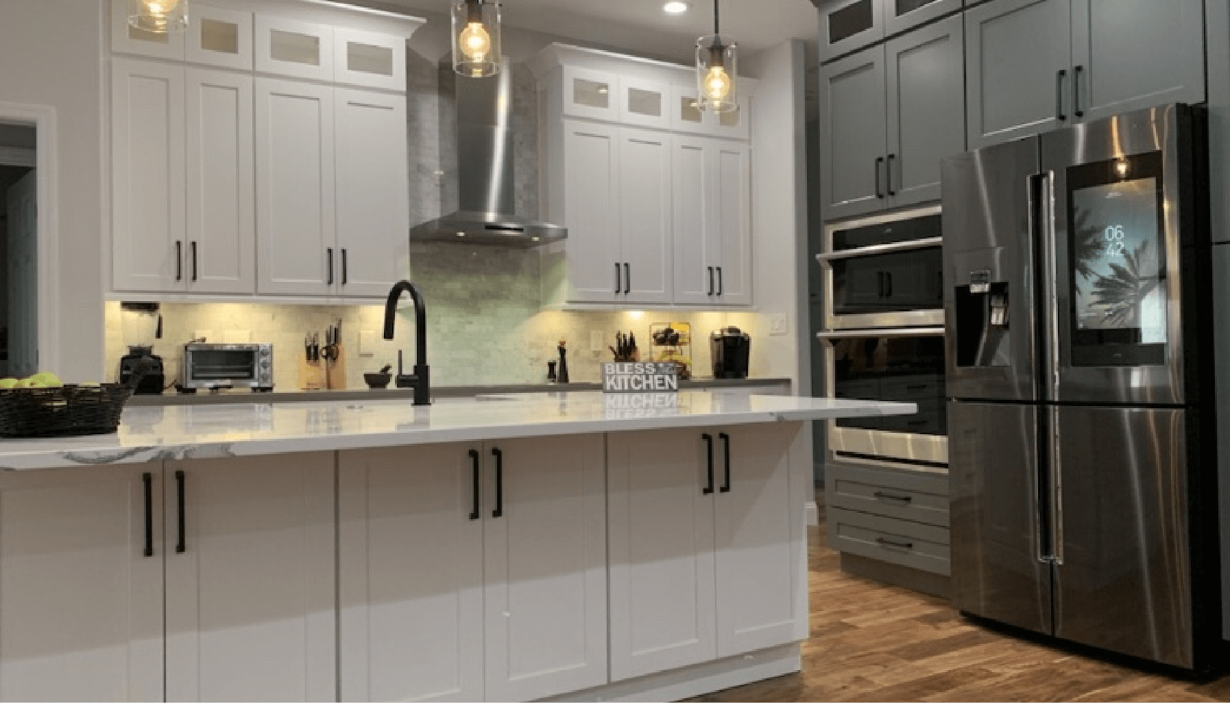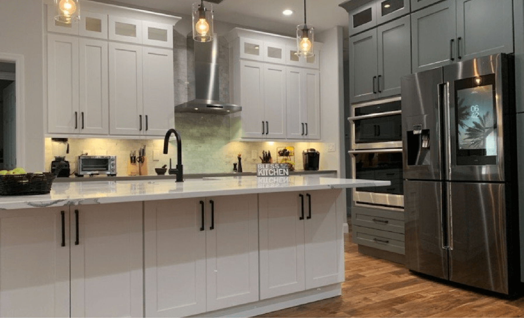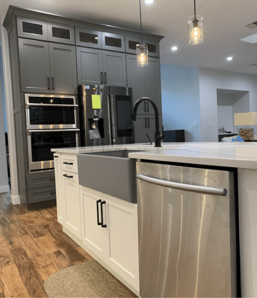 Client wanted an open concept kitchen and two toned kitchen. We created that and much more, we added stacker glass cabinets, creating a built-in refrigerator, adding a farm sink and also pendant lights above the island.