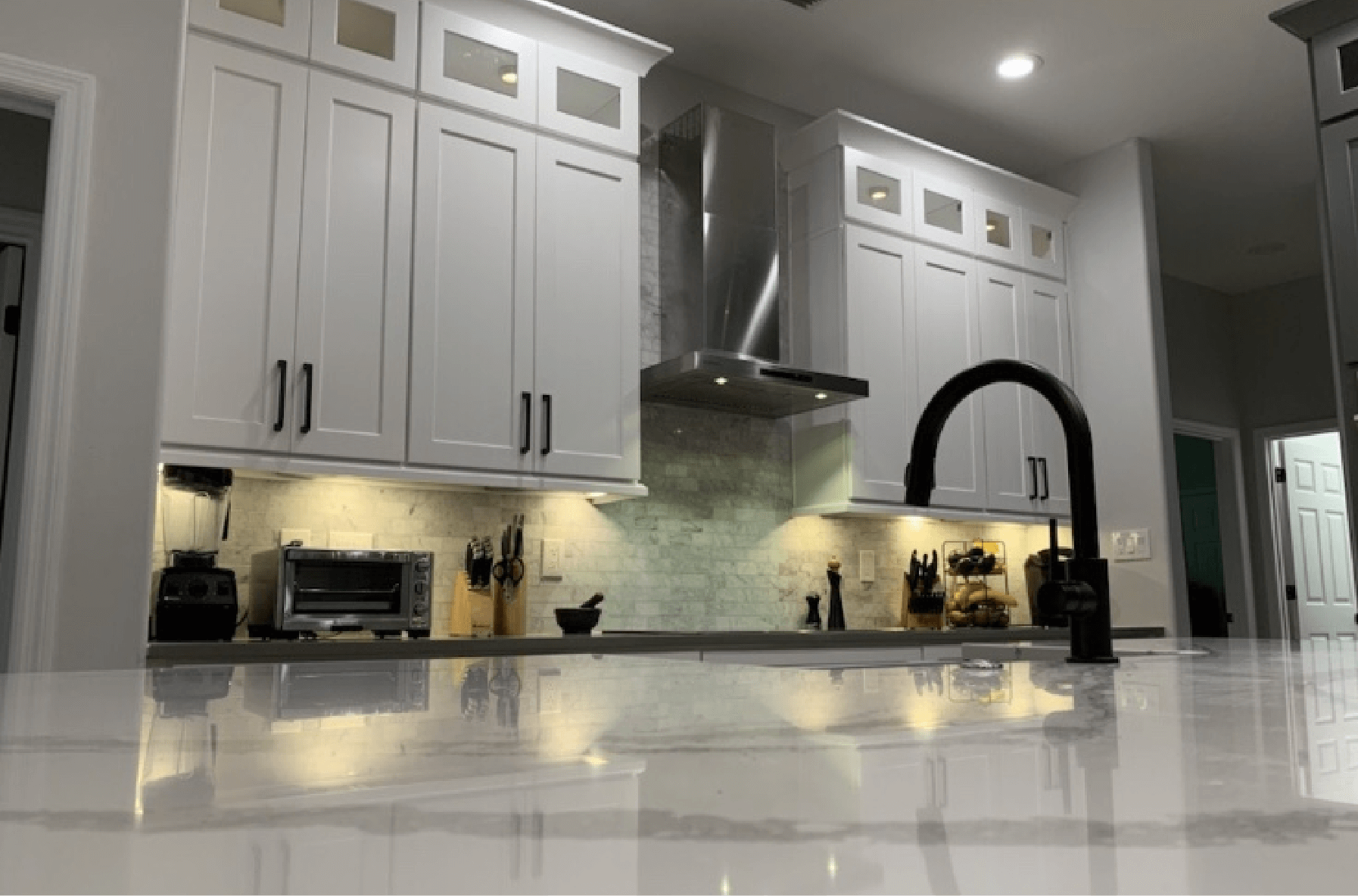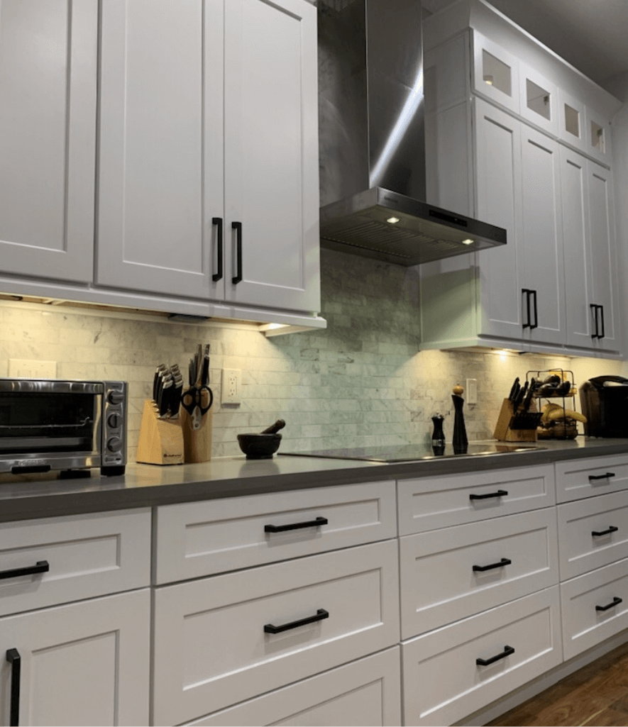 White and Gray Shaker cabinets with a full-time warranty countertop from Cambria.