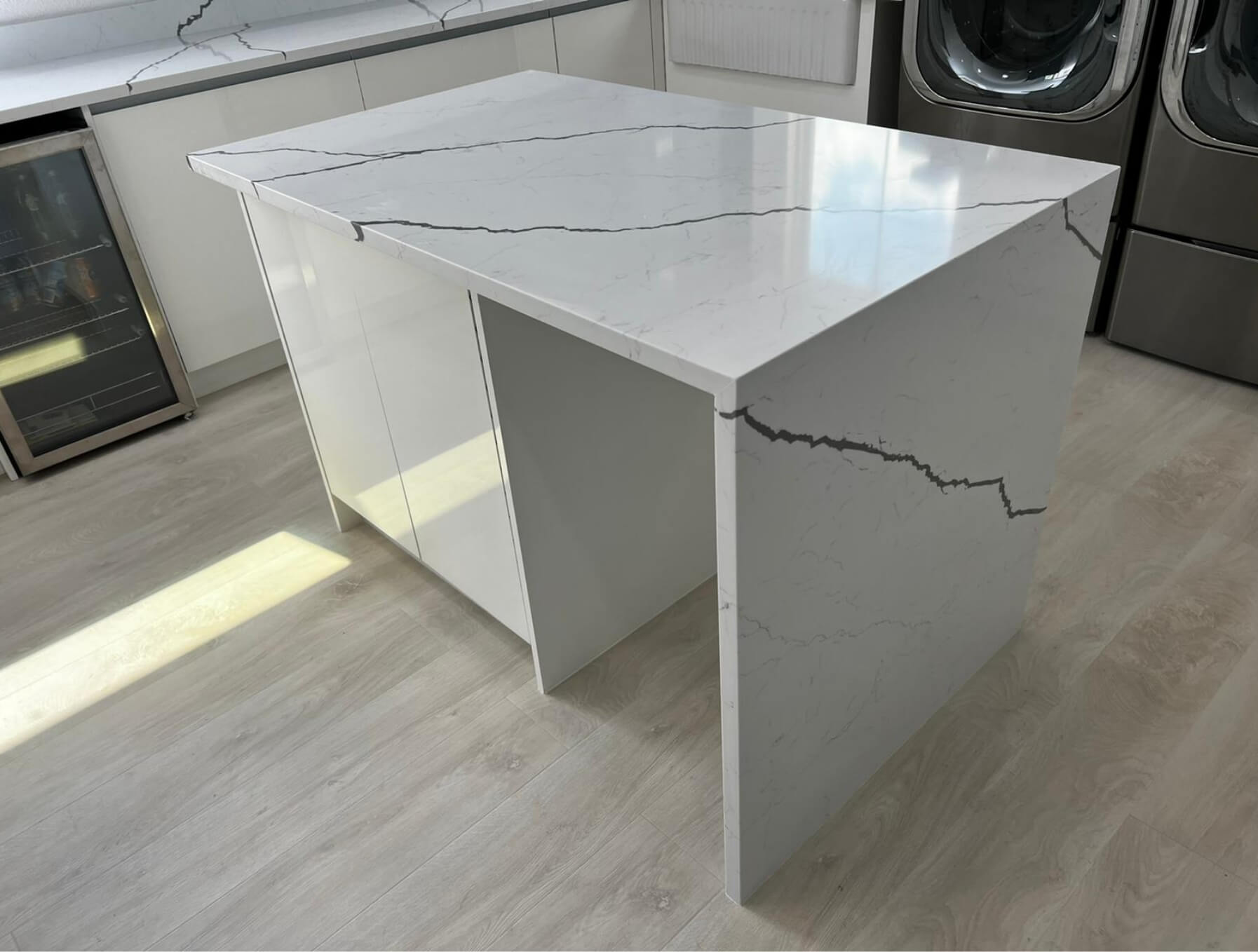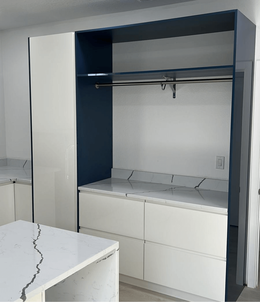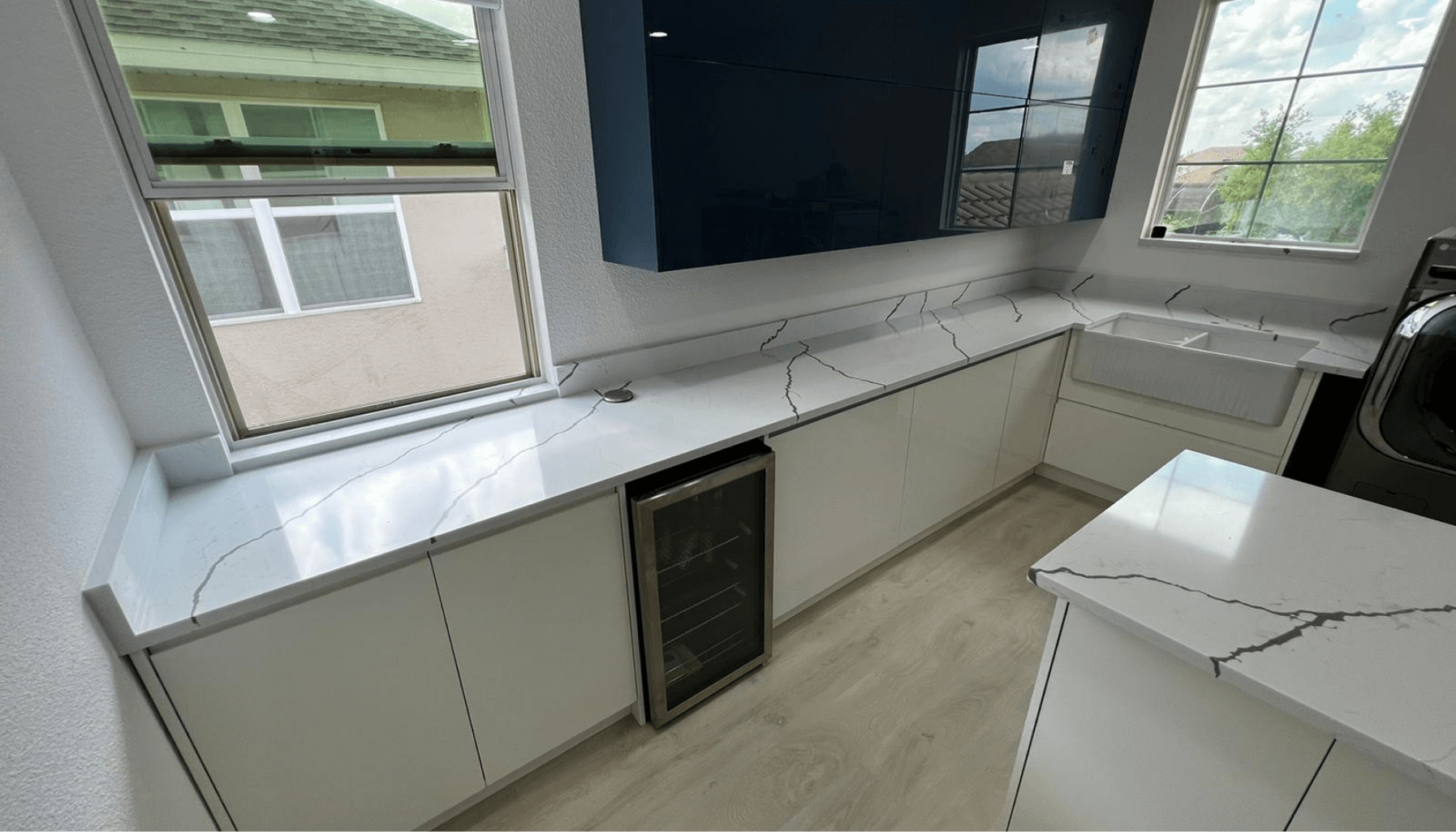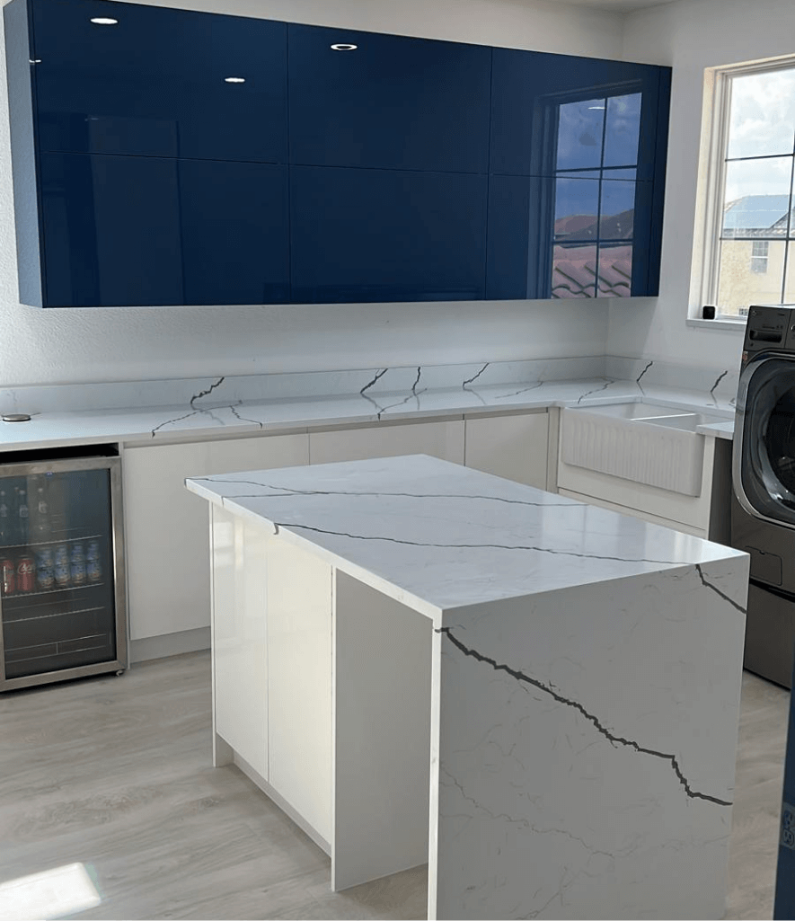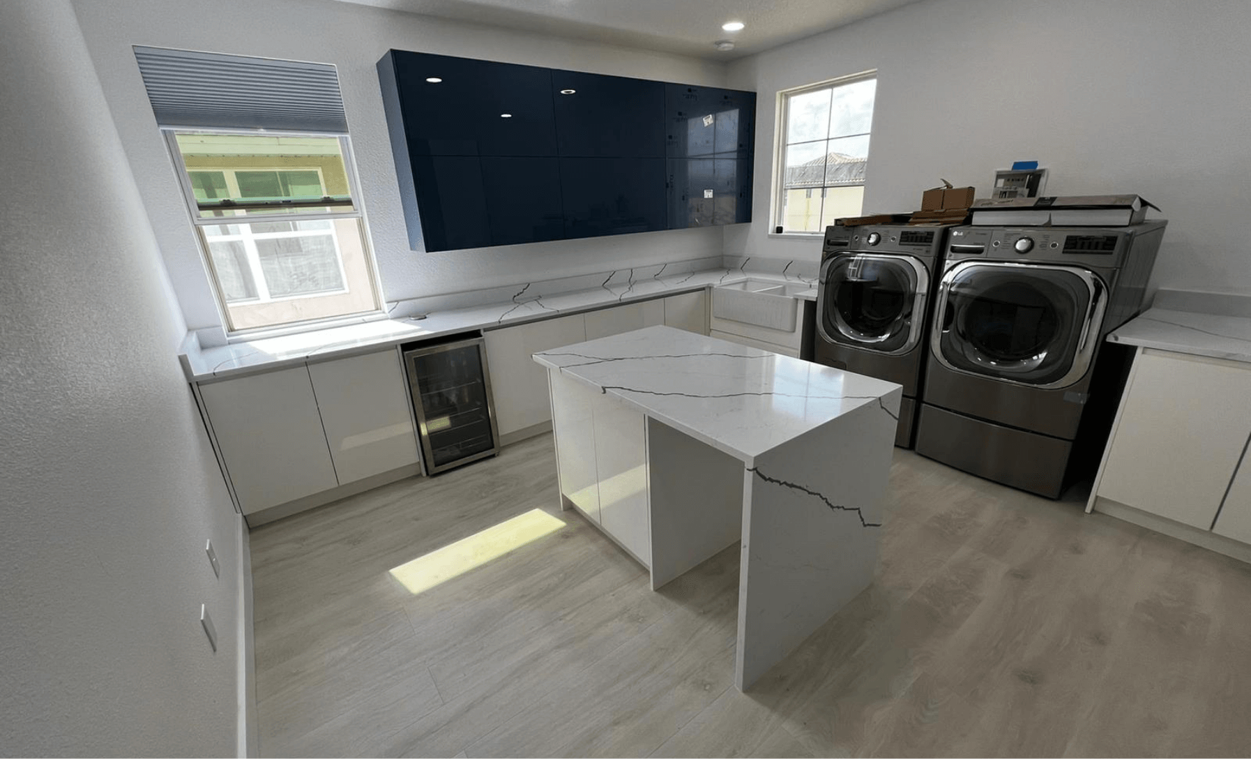 The client wanted more than a laundry; they wanted a relaxed area. We included a wine fridge, a white farm sink, hampers, an island with a waterfall, microwave, pop-up outlet, frameless cabinets Navy blue and white with quartz countertop